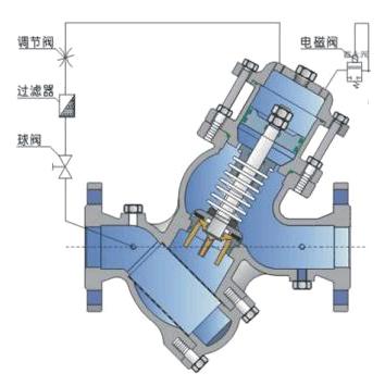 分隔膜型和活塞型两类:主要部件有一个主阀及其附设的导管、导阀、针阀、球阀和压力表等组成的。它利用上下游压力差为动力,由导阀控制、使隔膜(活塞)上方控制室内的压力水被排到大气或下游低压区时,作用在阀盘底部和隔膜下方的压力值大于上方的压力值,所以将主阀阀盘推到完全开启的位置,当进入隔膜(活塞)上方控制室内的压力不能排到大气或下游低区时,作用在隔膜(活塞)上方的压力值大于下方的压力值,所以会把主阀阀盘压到完全关闭位置,当隔膜(活塞)上方控制室内的压力值处于入口压力与出口压力中间时,主阀阀盘处于调节状态。